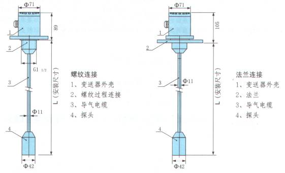 技術數據     工作電壓     12.5~30 VDC   輸出信號     4~20mA二線            0~20mA三線   測量范圍     0~4m(***大)   精度       0.2、0.5、1.0   穩(wěn)定性      優(yōu)于0.1%/年   允許溫度     介質    -20℃-70℃            環(huán)境    -20℃-70℃            貯存    -40℃-80℃   材料     傳感器外殼   不銹鋼1Gr18Ni9Ti                  不銹鋼噴涂聚四氟乙烯          連接桿     不銹鋼1Gr18Ni9Ti                  不銹鋼噴涂聚四氟乙烯           膜片     96%氧化鋁           密封     氟橡膠                  聚四氟乙烯          過程連接    不銹鋼1Gr18Ni9Ti  過程連接方式   外螺紋G1 1/2           法蘭             外形尺寸    安裝    桿式靜壓液位變送器有G11/2螺紋及法蘭兩種標準的安裝方式 螺紋安裝 對于直接使用G11/2螺紋安裝的變送器,供貨時提供一個G1 1/2圓螺母,一般安裝可有兩種方式。1、安裝位置已有G11/2螺紋。直接把液位變送器旋入即可,附帶的圓螺母可以不用, 也可以旋上用以防松。2、安裝位置無G11/2螺紋??衫矛F有的Φ50~Φ60的光孔,或安裝帶有Φ50~Φ60孔的支架,裝上液位變送器,并旋上圓螺母固定。 法蘭安裝標準供貨時法蘭的安裝尺寸符合DN50 GB9119.6-88