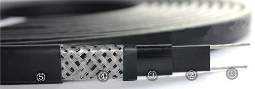 ① 發(fā)熱芯;② 復(fù)合絕緣層; ③ 外護(hù)套; ④ 金屬編織層; ⑤ 加強(qiáng)層