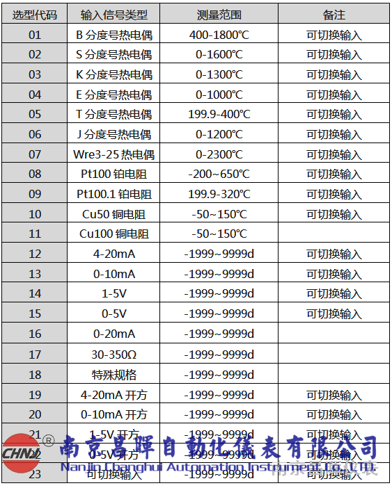 儀表輸入信號類型表