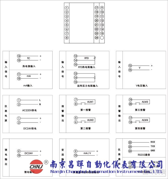 測量顯示+報(bào)警,儀表無通訊和變送輸出,4-20mA(wn****)輸入,帶上、下限報(bào)警/控制輸出,DC24V饋電輸出,儀表外為AC220V供電,儀表為外型為160×80mm橫式